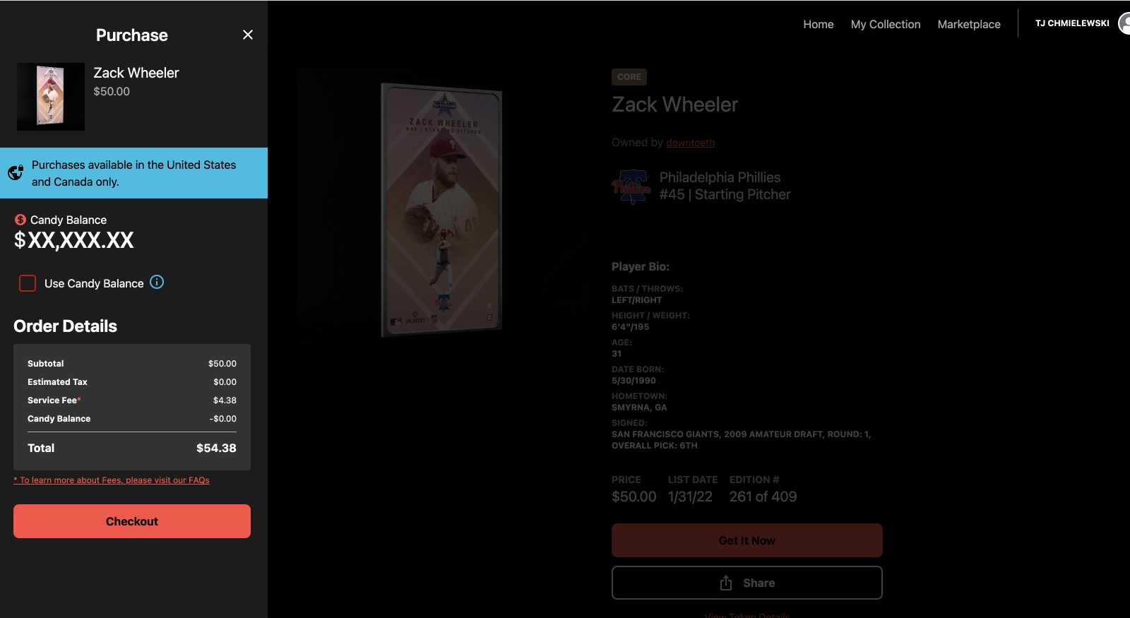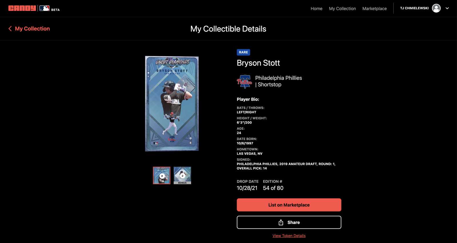 Candy provides a space to view your personal collection. I bought some Uncut Diamonds (rookie cards) the following day during that drop. I also picked up a MLB Play of the Day just to round out my collection.