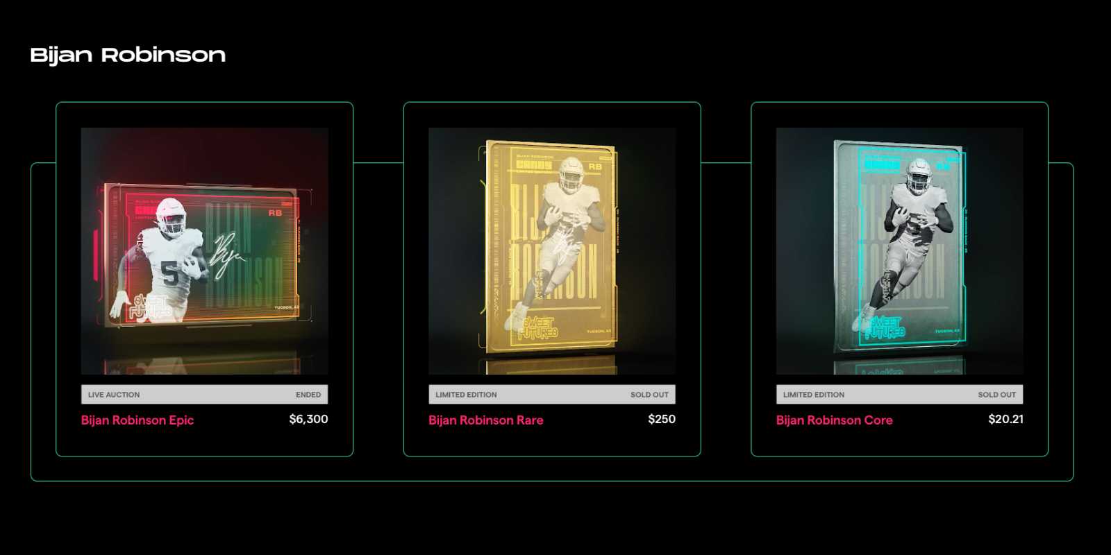 The cards are futuristic-looking and animated on an mp4. They feature the player’s name, position, jersey number, and where they are from. The college team they play for has been obscured from the helmets and jerseys. 2021 marks the first year that college players can market themselves without violating NCAA rules, so this is an interesting concept to me. It will be fun to explore and see how college athletes market themselves and build their fan bases as well as finally profit from their celebrity.