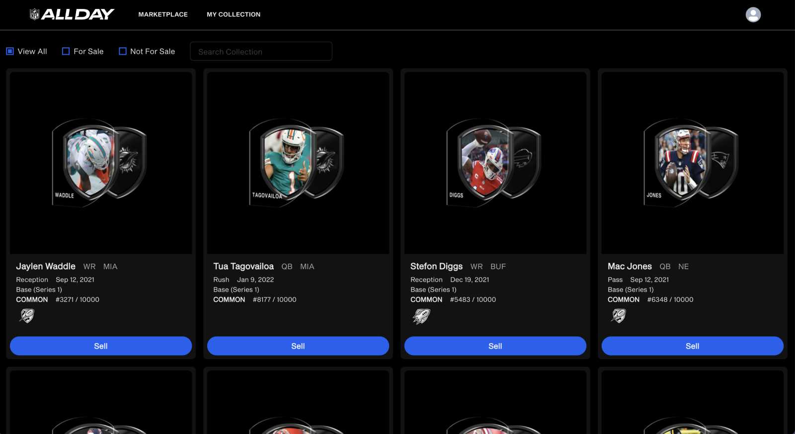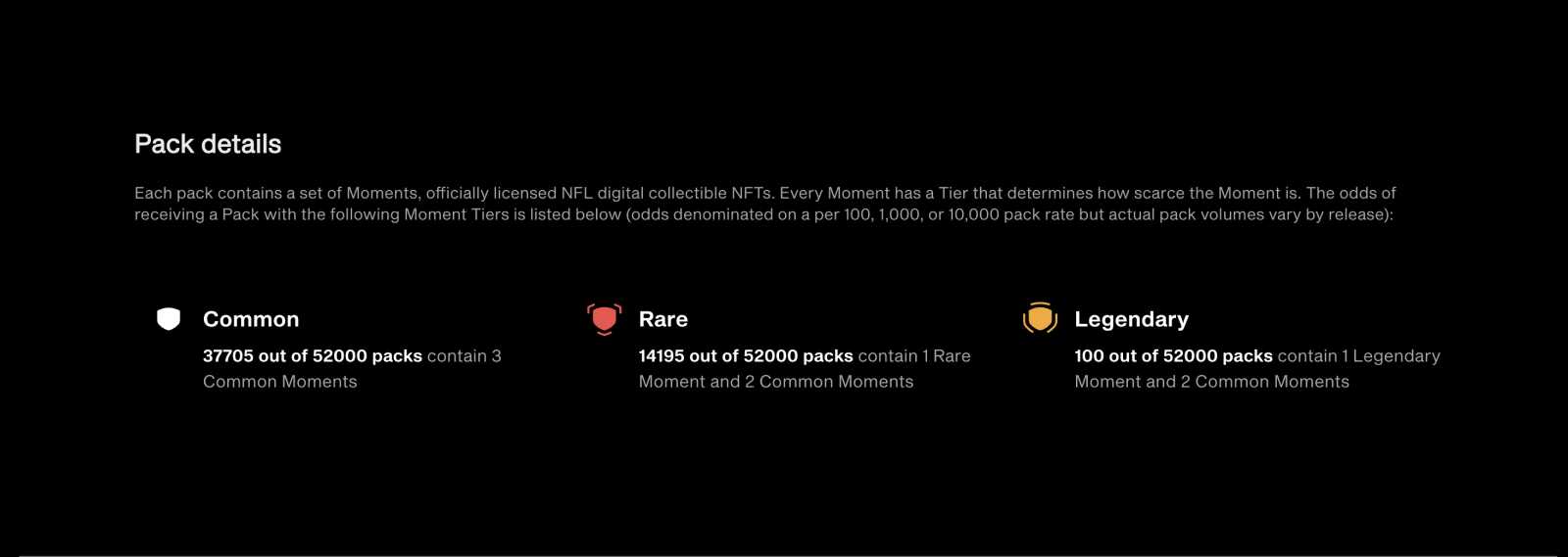 Moments on NFL ALL DAY have rarity tiers. Every highlight is part of a tier, which tells you how many of each Moment are available. The main tiers are Common (9,999+), Rare (499-2,000), and Legendary (100 or less)