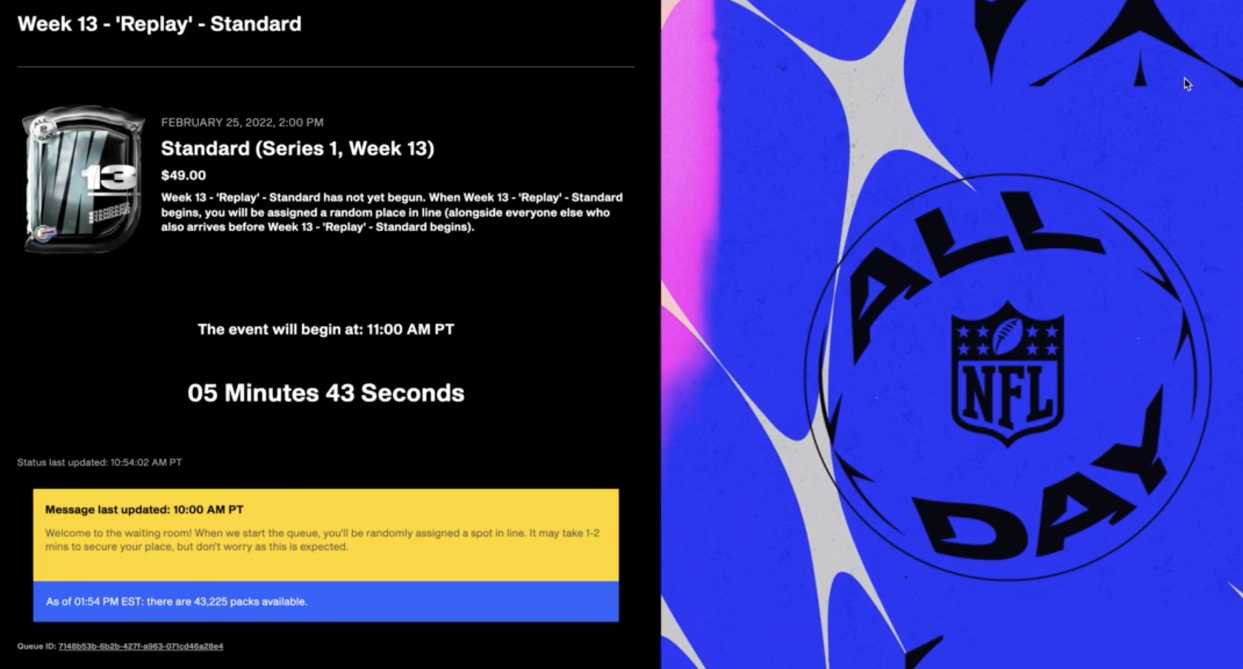 February 25, 2022, I finally got into the waiting room for their latest drop. Those invited could join the queue an hour before the drop. I speculate that the queueing was to reduce the load of users hitting the site and possibly the processing load of minting NFTs. NFL ALL DAY uses a system by Queue-It to manage its virtual line. Before the drop, there is a countdown clock. After the drop goes live, you are placed into a spot in line and given an estimation of wait time. My wait time was over an hour, but the queue-it function allowed me to put in my email and get a notification when my spot in line was ready for purchase.