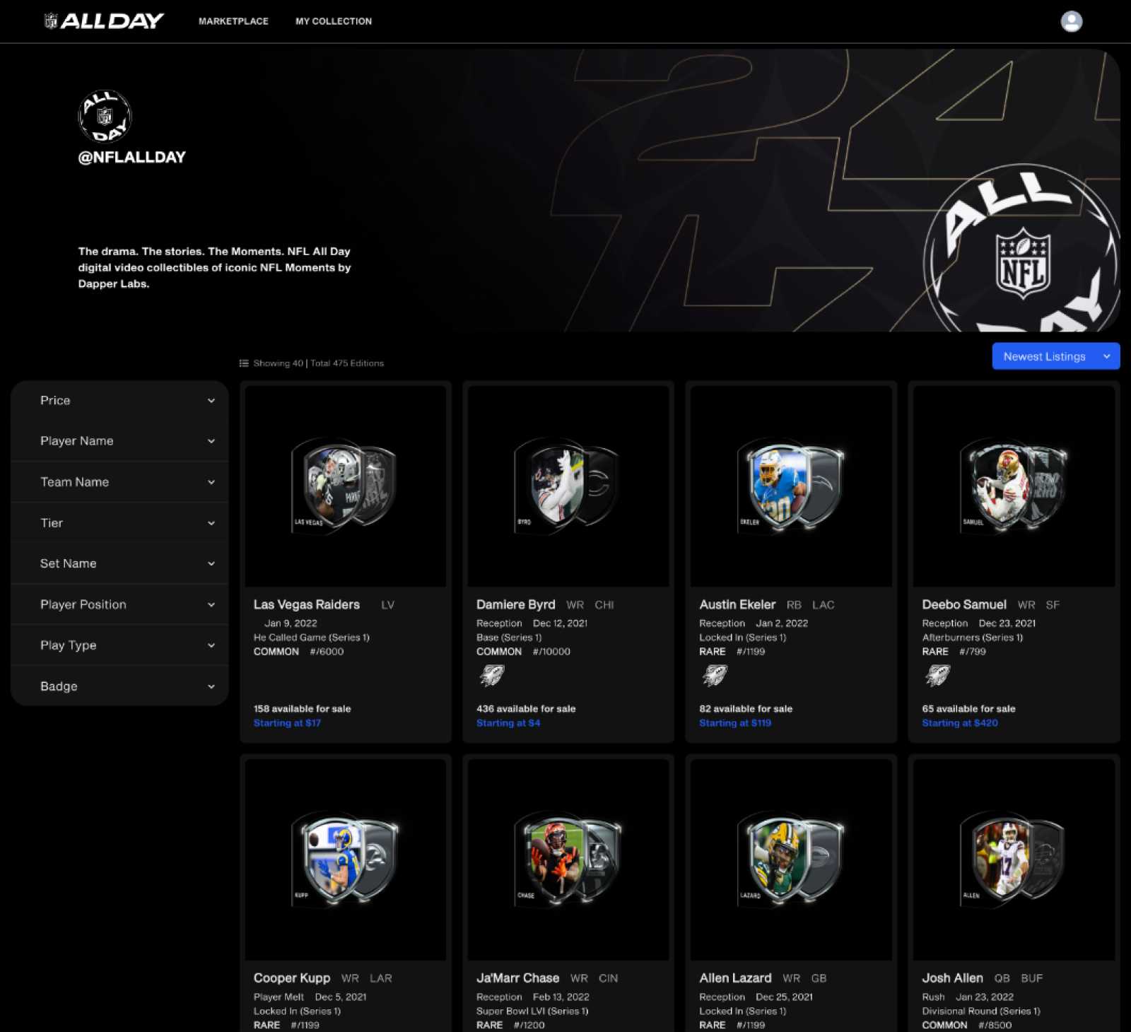 Like other formats, there is a “Collection” area to view the NFTs you own. It shows an overview of the player, the type of play, the date of the play being displayed, tier, and serial number: the lower the number, the more valuable the NFT. As mentioned previously, there is also a badge. You can put your Moment on the All Day Marketplace. One odd glitch to watch out for is that you won’t see any “sell” buttons when you go directly into your Collection. It would be best to go to the Marketplace first and select “Collection.” This is not inherently obvious, and I’ve seen questions about it on Discord.