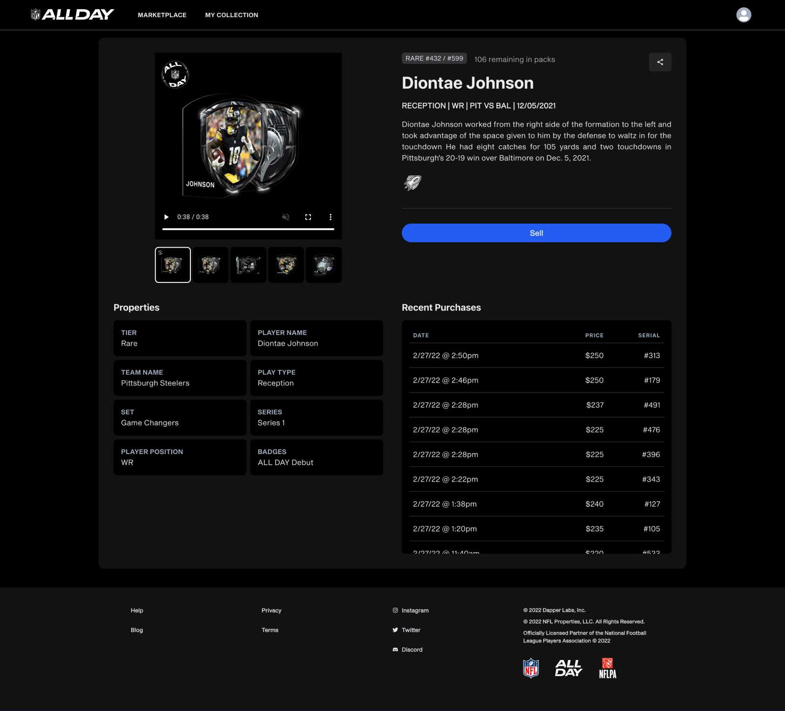 Each Moment has its own page similar to the NBA Top Shot Moment’s Detail page. However, NFL ALL DAY has much less detail removing in-depth player details, statistics, and game statistics. Along with the digital “trading card,” there’s a description of the play and Moment properties. Moment properties consist of the Tier, Play Type, and Series. There are also Set types and Badges.